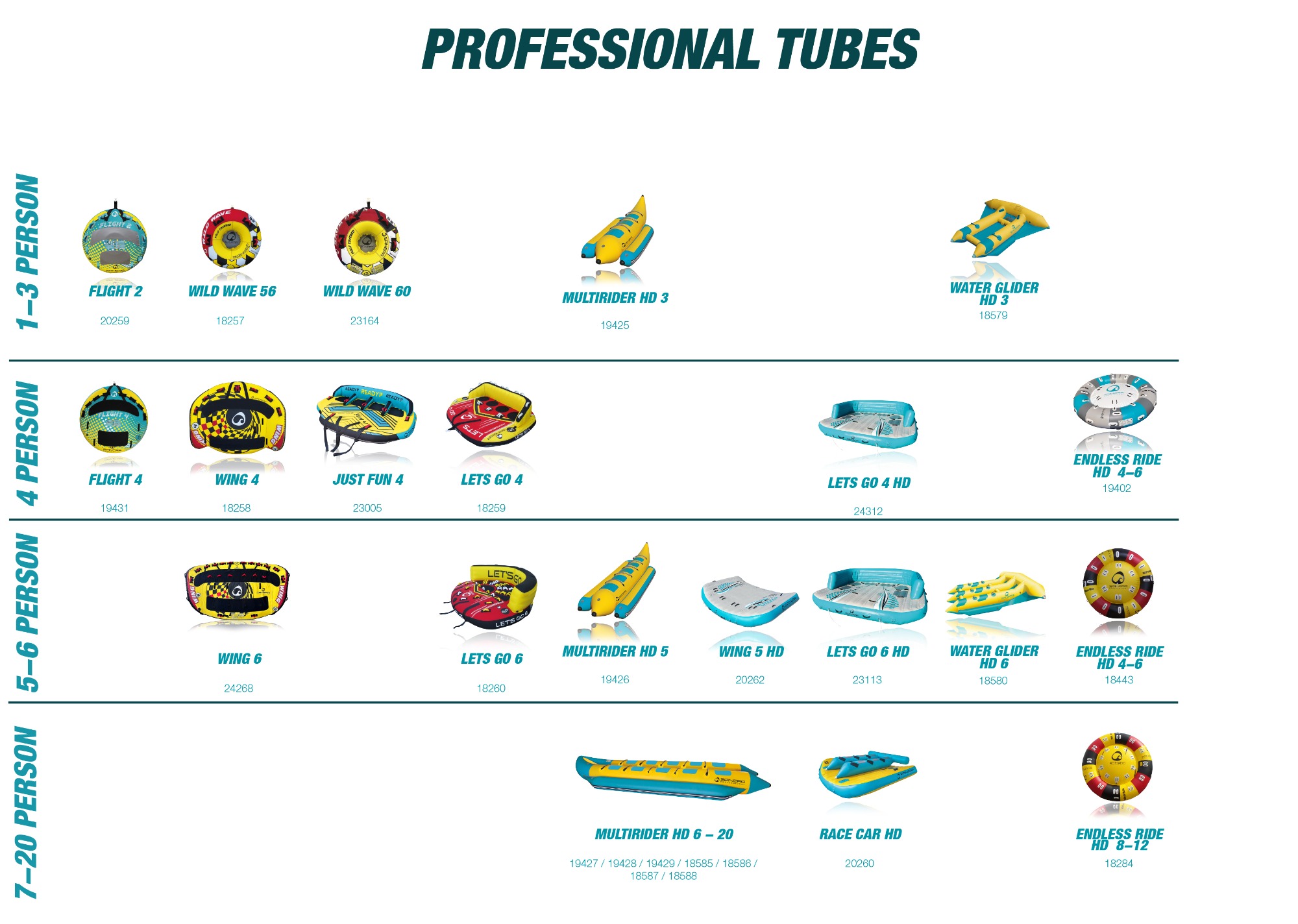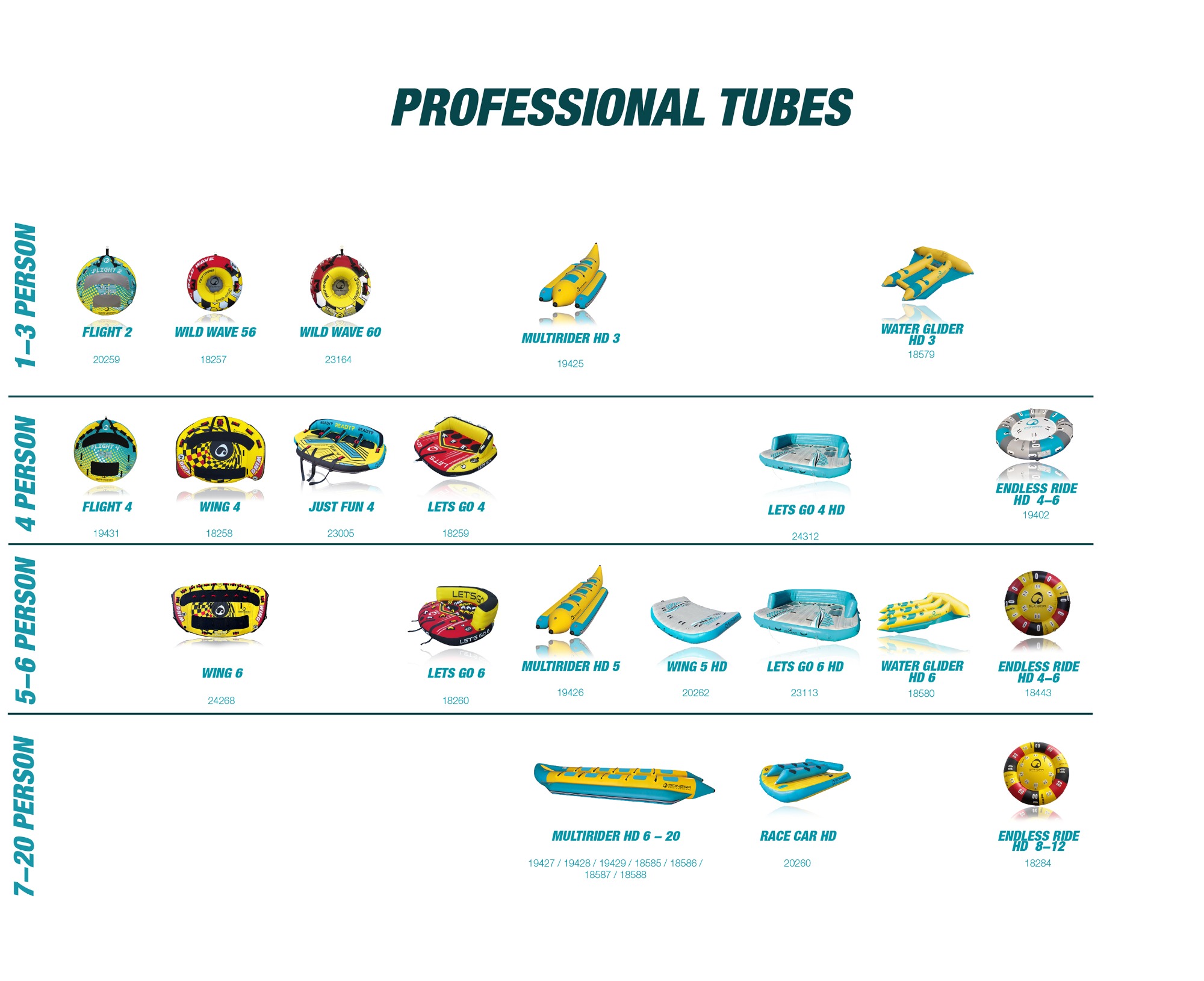 When considering the purchase of an inflatable tube, it is important to know in advance how many people should be pulled on a tube. The number of passengers is a decisive factor when choosing your tube. The capacity of the tubes varies from one person to groups. In our range of inflatable tubes, we offer sizes from 1 to 12 people in the private sector and even up to 20 people in the professional sector.